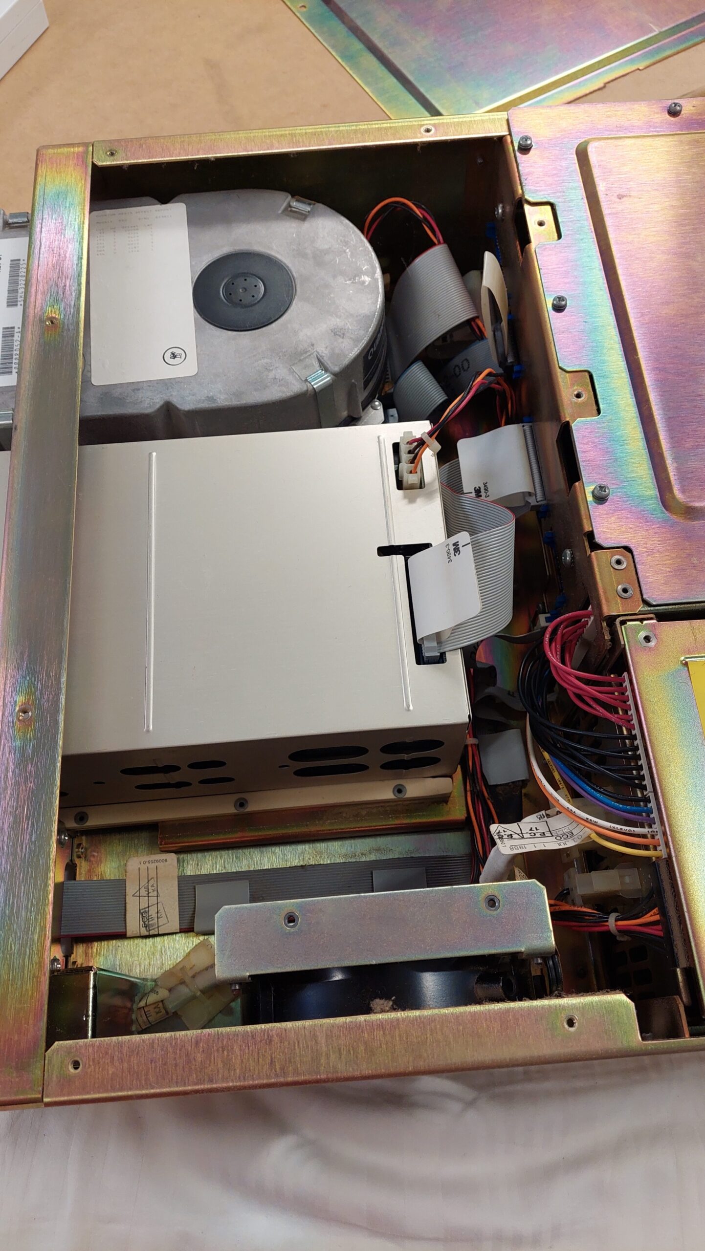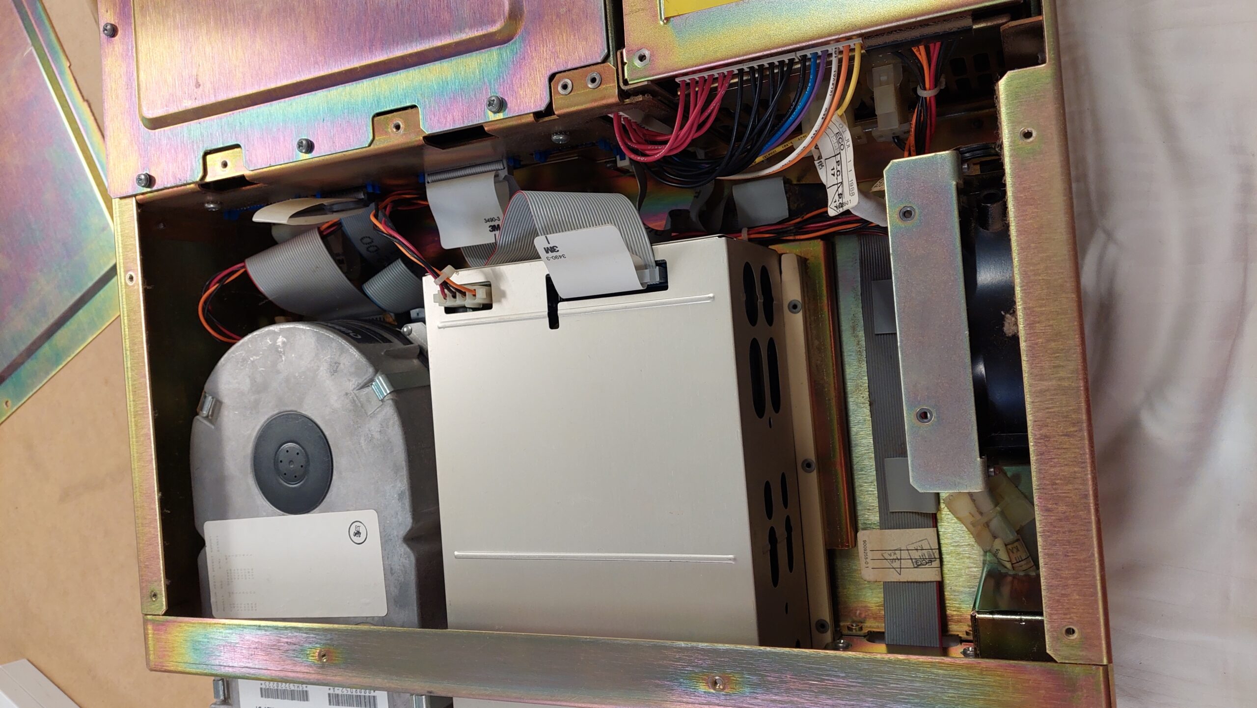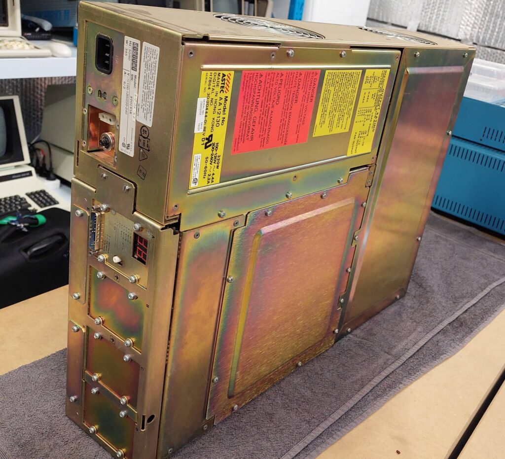 With two screws removed from the rear of the case the computer can be removed from its skin. The skin itself is very heavy and once gone the computer can be easily lifted on to a bench by two people.