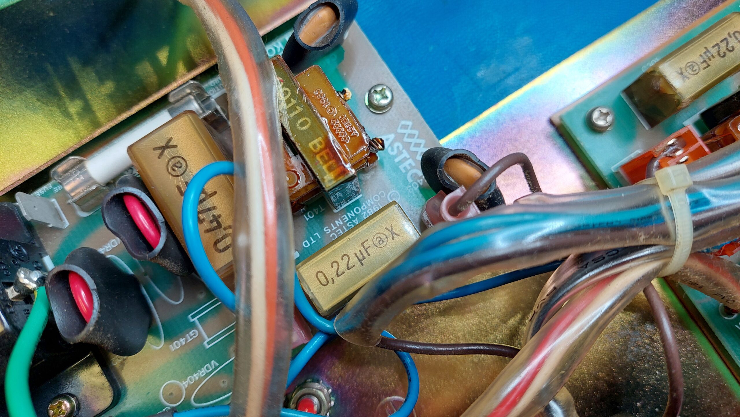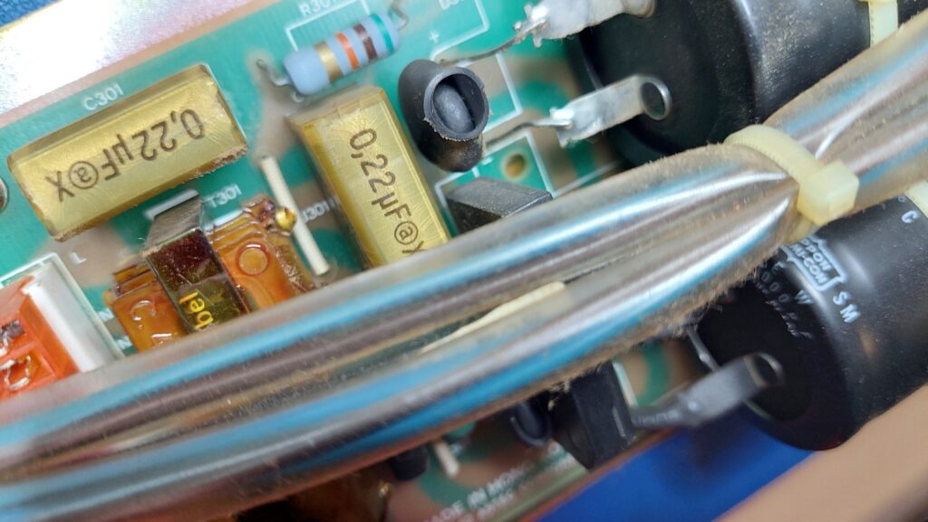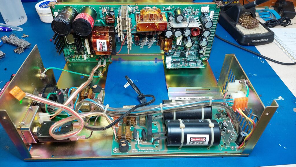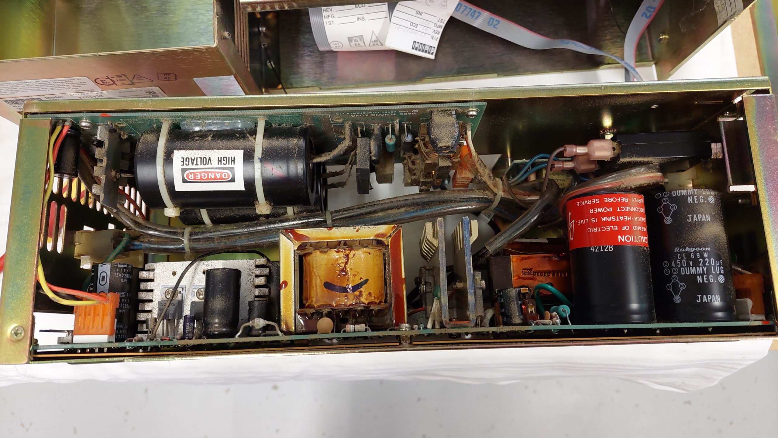 A few screws and some cable disconnections and the power supply is out. There are 4 RIFA line filtering capacitors and they are cracked as expected. There are no obvious issues with any other companents.